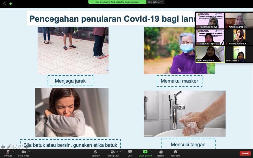 Hal ini menjadi pembahasan pada webinar kesehatan bertajuk “Peningkatan Pemahaman Kader Kesehatan Lansia Dalam Kewaspadaan Covid-19“, yang digelar Divis Ilmu Keperawatan Komunitas Keluarga dan Gerontik Fakultas Keperawatan (FKep) Universitas Hasanuddin.